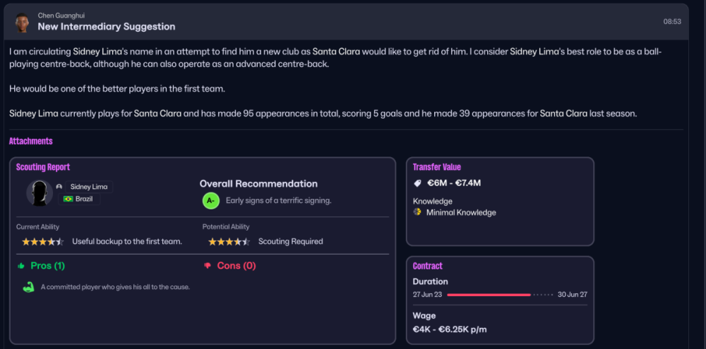 De grootste frustratie die ik tot nu toe heb met de nieuwe UI is dat dit soort schermen zo ongelooflijk leeg zijn Waarom st aat hier niet gewoon meer informatie zodat je sneller dingen kan zien. Nu moet je in de tekst lezen dat het een centrale verdediger is. Ook lijkt mij hier gewoon voldoende ruimte om de attributen te laten zien of in ieder geval de club waar de speler speelt, icoontjes of de speler al in de belangstelling staat van andere teams/er al op geboden is of desnoods de Season Stats van een speler. Verder blijft het af en toe nog wat zoeken, maar dat gaat steeds makkelijker en gaan sommige dingen nu sneller dan in oude FM's